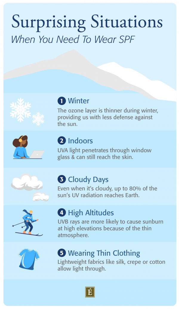 Clearly, sun exposure can have a profound effect and potentially cause premature skin aging, skin cancer and many other skin changes. If you think you can avoid the sun’s rays in winter or by sitting in the office, you might be surprised to learn about these next situations when SPF is still a must: