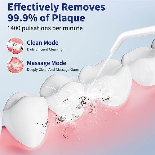 【Deeply Clean & Improve Gum Health】With upgraded pulse cleaning technology,0.6mm ultra fine water flow,1400 pulse per min,this water dental flosser removes up to 99.99% of dental plaque and food residue, 80% more effective than string floss. Our water tooth cleaner has FDA, FCC, CE certifications, effectively addresses 8 kinds oral issues such as braces, sensitive gums,decay, bad breath,etc, allowing you to smile confidently without relying on dentists.