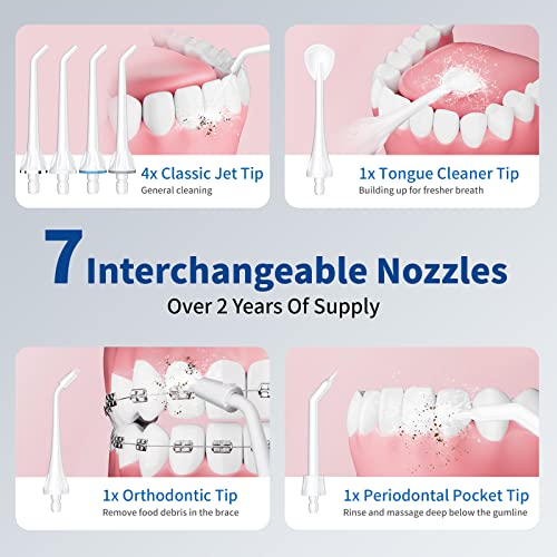 【Versatile 7 Replaceable Jet Tips】 Our water flosser comes with 7 interchangeable jet tips to cater to diverse users and needs,allowing you to customize your flossing. Including 4x standard tips, 1x tongue cleaner tip, 1x orthodontic tip, 1x periodontal pocket tip, making it suitable for multiple users and needs,ensuring optimal oral hygiene for everyone.Perfect for every family member and oral care need.