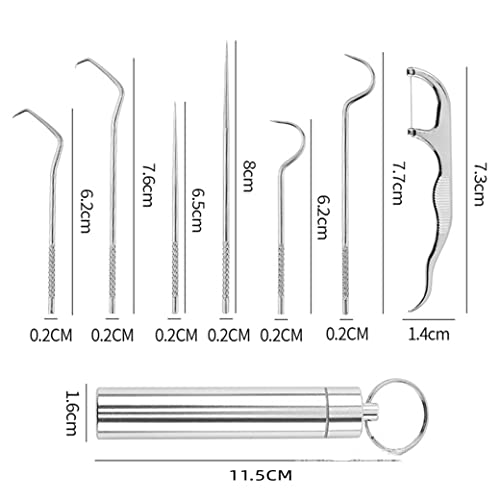 Features:Triangle toothpick: Used in between the teeth and Clean the residue at the dead corner of the root inside the tooth. Half-moon toothpick: Remove the residue between the teeth and Remove the calculus at the root of the tooth.One- character toothpick: Remove the surface of the teeth.Toothpick Holder: Come with a king ring and you can carry it anytime and used for easy storage of toothpick. Specification: Material: 304 stainless steel Color: Silver