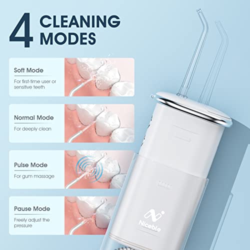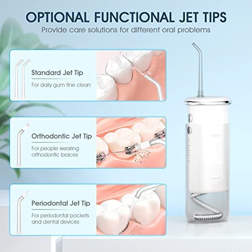[4 Modes and 4 Jet Tips] Water flosser have 4 interchangeable cleaning modes: normal, soft, pulse, and pause, 4 flosser tips (2 standard jet tips, 1 periodontal tip, 1 Orthodontic tip), suitable for multiple family members and needs.
