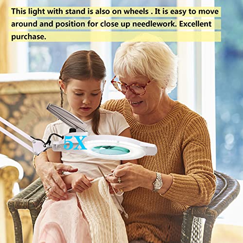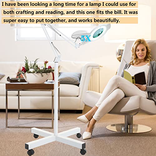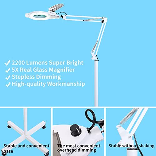 KIRKAS 5X Magniyfing Floor Lamp with 4 Wheel Rolling Base 2,200 Lumens Super Bright Glass Lens LED Magnifier, Adjustable Stand & Swivel Arm Floor Lamp for Estheticians, Reading, Crafts, Tasks- White