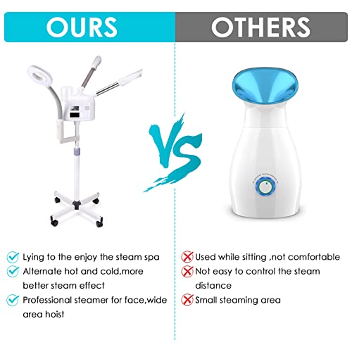 ⭐Great Quality-Steamer for face spa on wheels,high quality warm stainless steel pipe, sturdy and durable, high capacity water cup, can store 1000ml water, the steamer generates the mist quickly with 1-3mins,the head of the machine is free to rotate 360°. Adjustable height from 38.1″ – 48″.