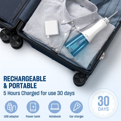 UP TO 30 DAYS OF USE & PORTABLE DESIGN: The water teeth cleaner can be used continuously for 30 days after 5 hours of full charge. The water cordless flossers can be conveniently charged with USB-enabled devices such as power banks, computers, laptops, and much more. Perfect for travel and home use!